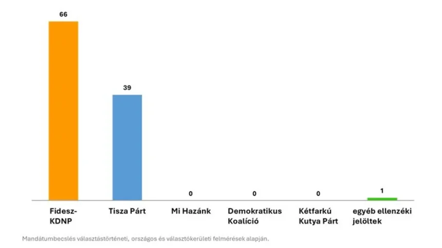 A felmérés 44 választókerületet minősített biztosan Fidesz-győzelmesnek, további 22-ben pedig nagy valószínűséggel diadalmaskodik a kormánypárt jelöltje. Ezzel szemben balliberális kötődésű intézetek folyamatosan jelentős Tisza Párt győzelmet jeleznek. Kiszelly Zoltán rámutatott: „Magyarországon több ellenzéki közvélemény-kutató intézet számai azon a vélelmezésen alapulnak, hogy 90 százalék körüli, vagy fölötti lesz a részvétel, ami a mai tudásunk szerint nehezen elképzelhető, a kommunizmusban volt legutóbb ekkora.” Mráz Ágoston Sámuel, a Nézőpont Intézet vezérigazgatója választástörténeti adatokra és választókerületi kutatásokra hivatkozva azt mondta: „Narancssárga lesz ismét az ország.”