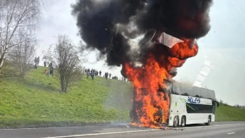 Vasárnap délután drámai jelenet játszódott le az M6-os autópályán, a West Midlands térségében: lángba borult egy Manchester City-szurkolókat szállító autóbusz, amely a Wembley Stadionba tartott volna az Arsenal elleni Ligakupa-döntőre. A fedélzeten utazó szurkolókat időben kimenekítették, sérülés nem történt, ám az eset komoly közlekedési káoszt okozott és súlyos kérdéseket vet fel a tömegközlekedési járművek műszaki állapotáról és biztonsági felügyeletéről.